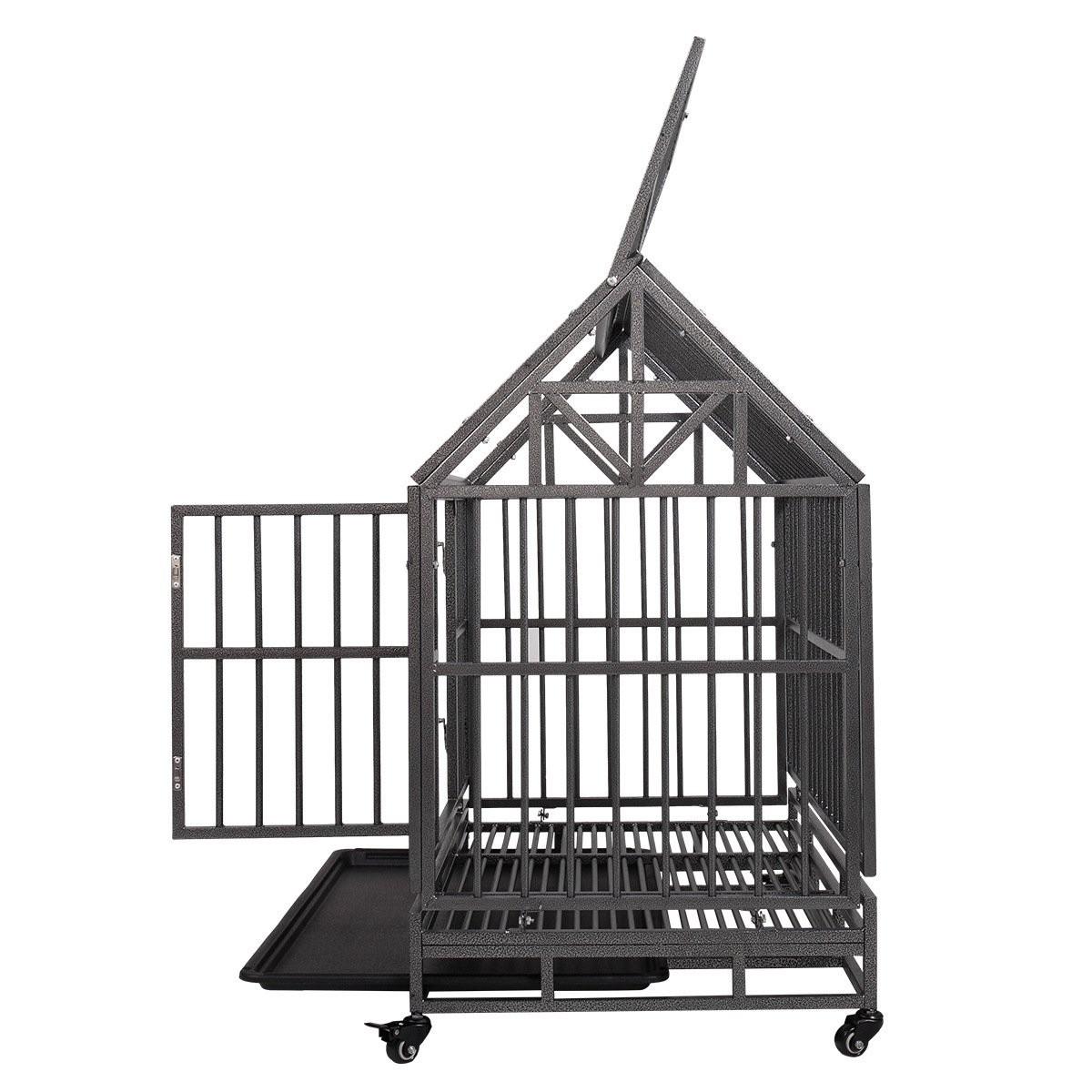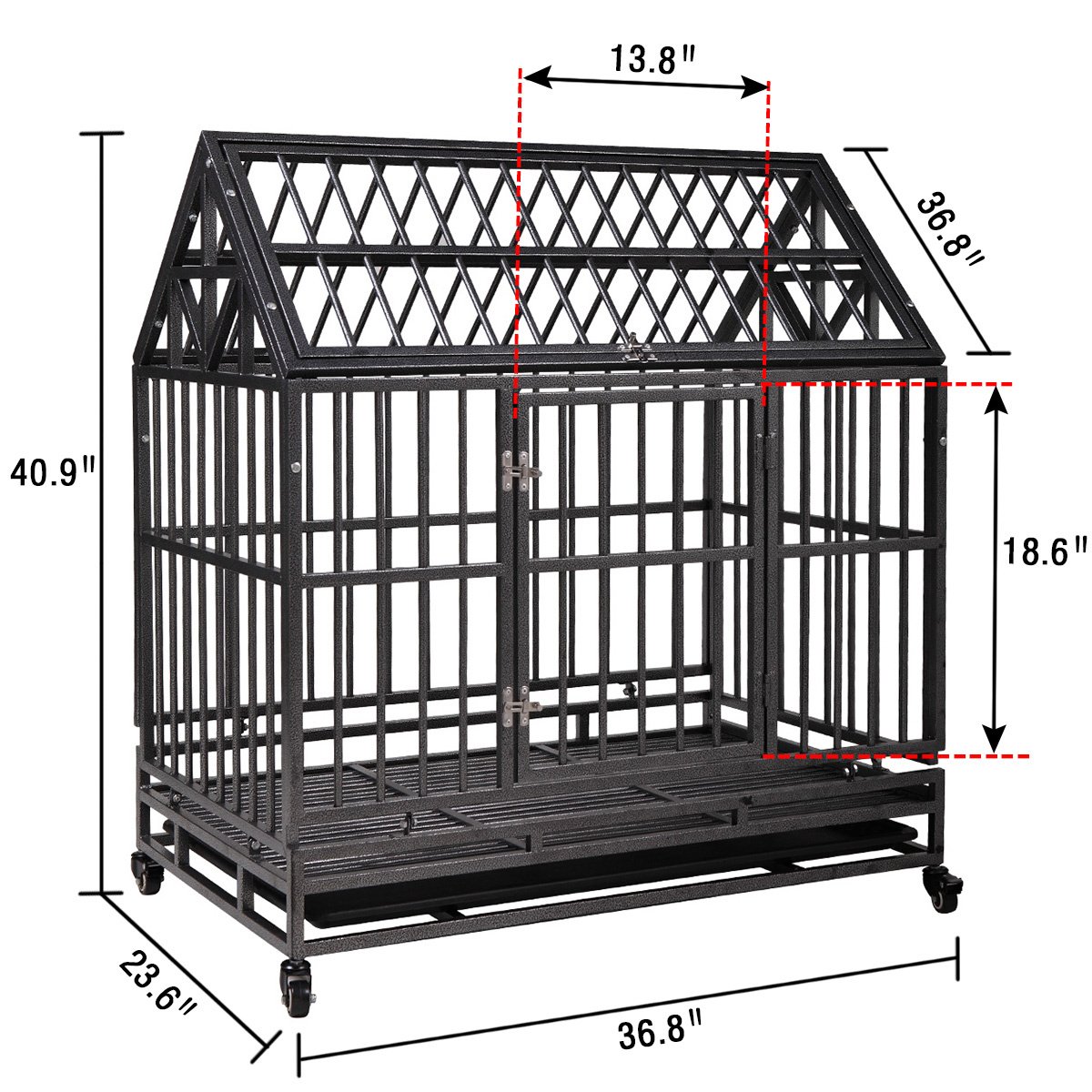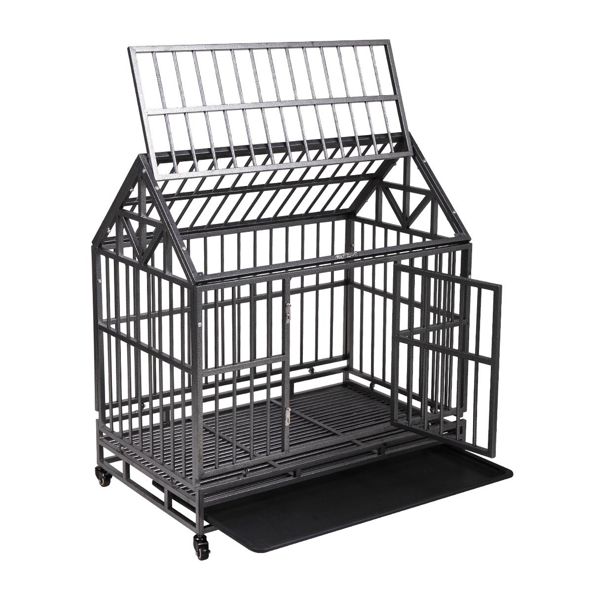 37"L x 41"H Heavy Duty Metal Dog Kennel Cage Crate with 4 Universal Wheels, Openable Pointed Top and Front Door, Black