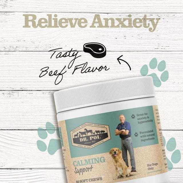 About Dr. Pol Calming Chews for Dogs Puppy anxiety is a normal part of life, but if your furry friend is shaking in their boots, they may need some relaxation assistance. Luckily, Dr. Pol Calming Chews for Dogs are formulated to help with just that. From travel nervousness to separation anxiety, there are countless things that can trigger your pet's unease. A simple, tasty anti-anxiety and melatonin dog treat can assist in relaxation and sleep, keeping your pet blissful and calm. These dog calming treats utilize not only the sleep chemical melatonin but also four other active ingredients to help calm their mind and body. Botanicals including passion flower and chamomile are known for their relaxing properties, and they work alongside amino acid L-Tryptophan to help quiet anxiety and hyperactivity. For a dog melatonin is a fantastic sleep aid as it works with the body naturally. As well, these dog chews can function as puppy calming treats, as they are safe for pups 12 weeks and older. When you're looking for dog stress and anxiety relief to help stop dog barking, quiet anxiety, or ease travel nerves, reach for a well-rounded supplement with botanicals, amino acids, and melatonin for a balanced approach that is sure to help. Give your pup the gift of calm with Dr. Pol Calming Chews for Dogs!