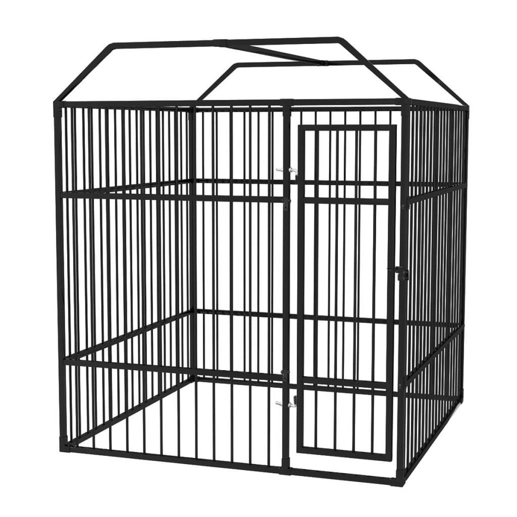 This large dog kennel provides ample exercise space while the steel bar walls help prevent mischief and unexpected accidents while enabling ventilation. Thanks to the sturdy and heavy-duty steel construction, this high-quality dog kennel is durable and built to last. The included fire-resistant and UV protected roof is made of 100% polyethylene and provides protection from the sun, rain, snow, and other weather conditions. The hinged door has a lockable latch system which ensures extra security and safety for your dogs. Assembly is really easy.