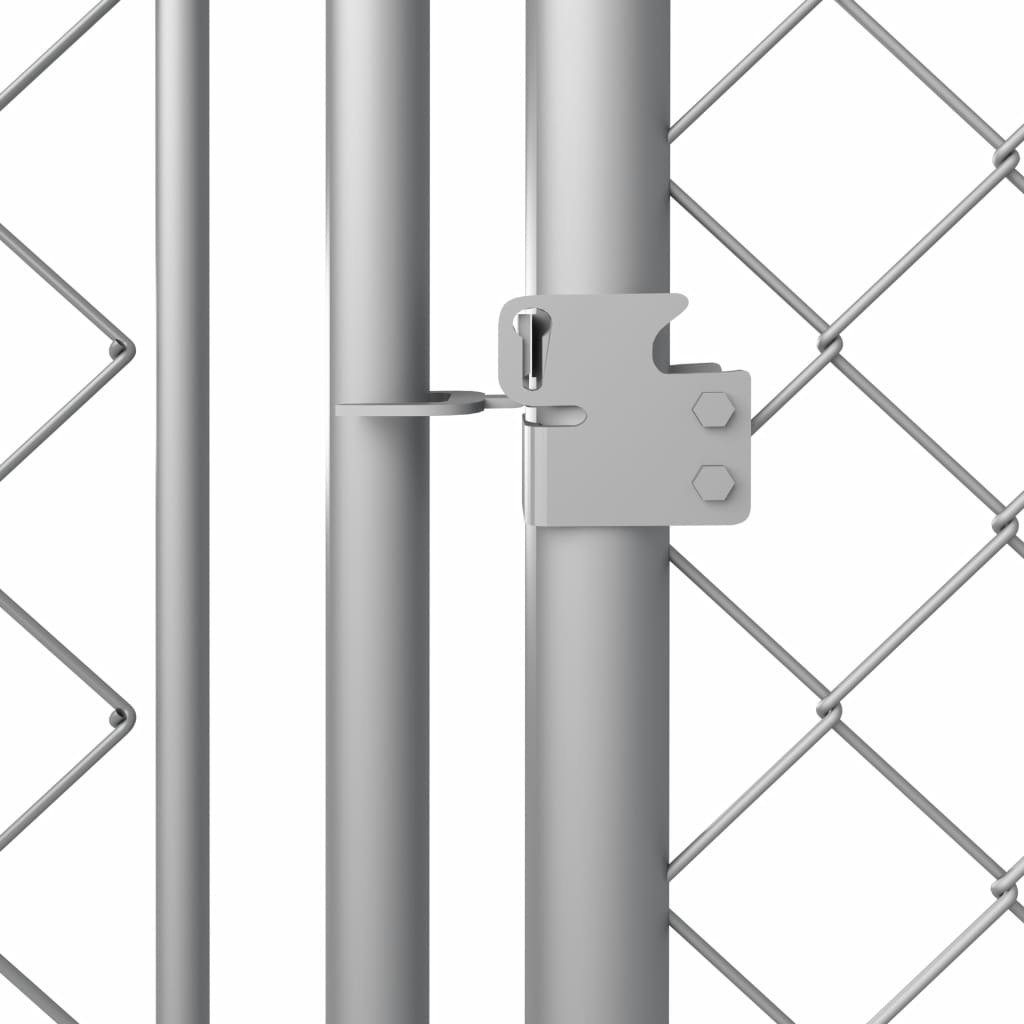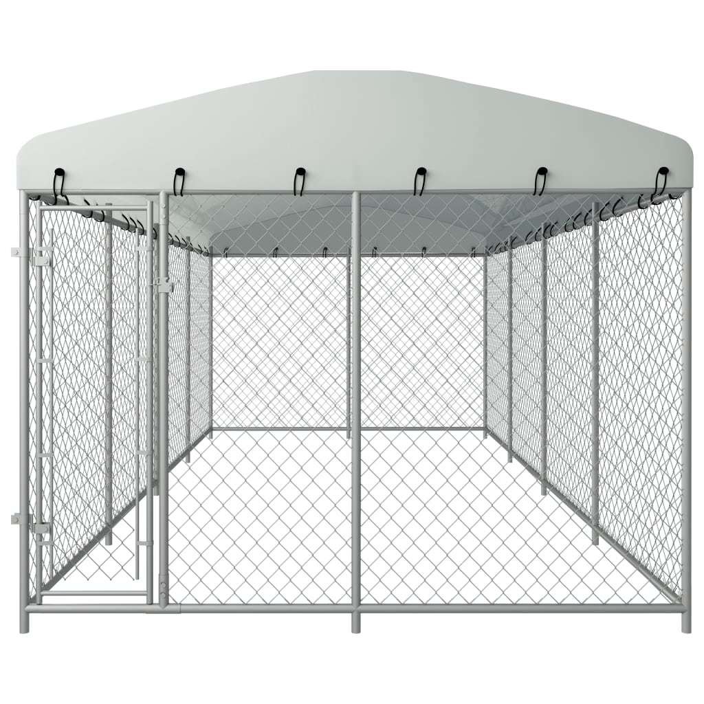 This large dog kennel provides ample exercise space while the chain link mesh all around helps prevent mischief and unexpected accidents; while enabling ventilation. Thanks to the sturdy and heavy-duty galvanized steel construction; this high-quality dog kennel is durable and built to last. The included top canopy; made of 100% polyethylene; is fire-resistant and UV protected; providing protection from sun; rain; snow and other weather conditions. The hinged door ensures extra security and safety for your dogs thanks to the lockable latch system. It is easy to assemble.Color: SilverMaterial: Galvanized steelRoof material: 100% PEOverall dimensions: 24.9' x 12.5' x 7.5' (W x D x H)Wall height: 72.8"Ground surface area: 344.4 ft²Lockable latch systemChain-link mesh sidewallsSuitable for dogs