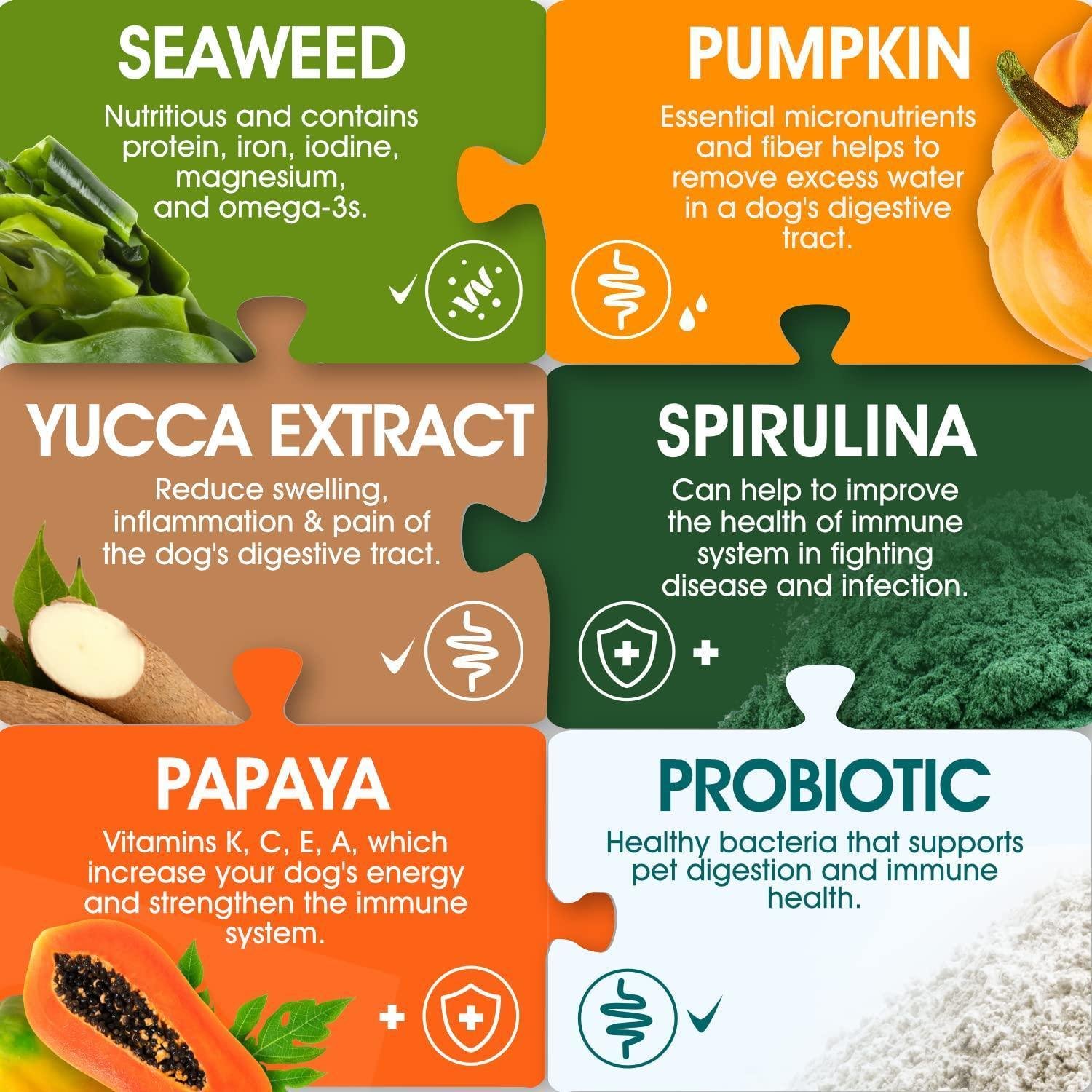 1.Our 11 in ONE probiotics for dogs & puppies contain: 6 strains Probiotic Blend ( 1 Billion/CFU), Enzyme Blend, Fungal Pancreatin, Papaya, Pumpkin, Seaweed, MSM, Fennel Seed, Spirulina, Yucca which help control seasonal allergies,itchy skin, support digestive and immune system.