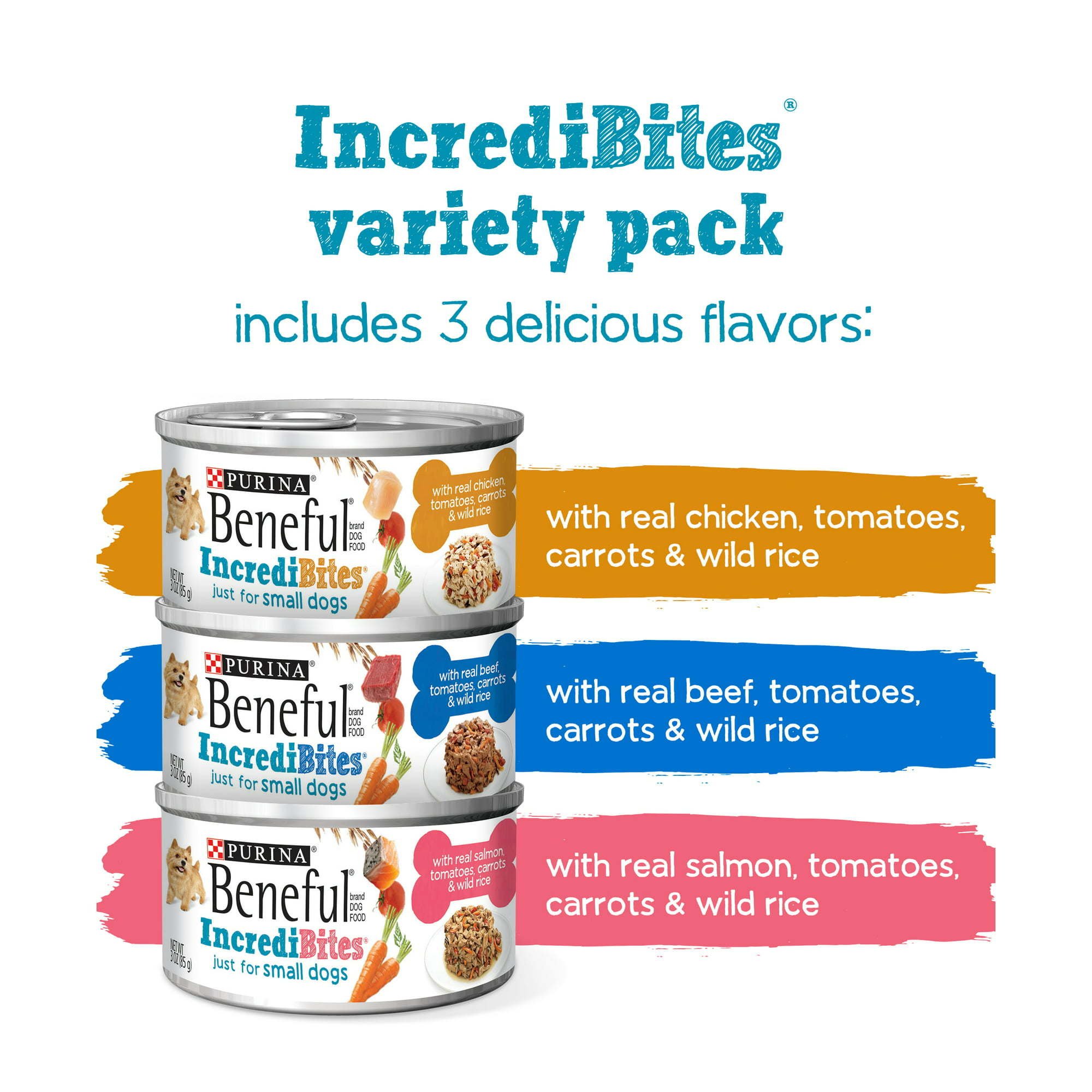 Purina Beneful Incredibites Wet Dog Food for Small Dogs, Feed your small dog an assortment of big flavors and provide wholesome nutrition with a Purina Beneful IncrediBites adult wet dog food variety pack. Each of these protein-rich recipes features bite-sized, meaty chunks that are easy for his small mouth and teeth to manage along with a touch of savory sauce. Our premium small breed dog food is made with real salmon or farm-raised beef or chicken to help provide a variety of delicious flavors sure to keep mealtime exciting for your pal. We craft each small dog food recipe with no artificial colors, flavors or preservatives.