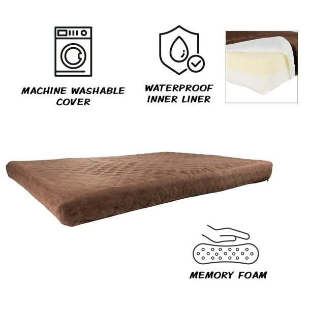 PRODUCT DETAILS –Materials: Microsuede, Polyurethane Foam, and Memory Foam. Dimensions: (L) 44' x (W) 35' x (H) 3.5'. Large Dog Bed with Removable Cover is Recommended for Pets Weighing 65-110 pounds. Color: Brown.
